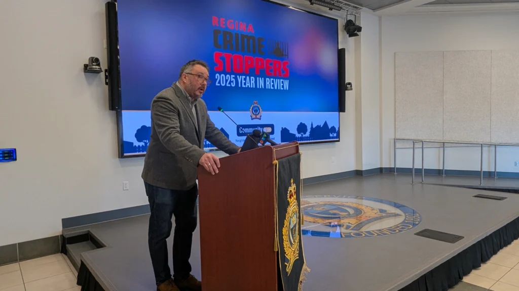 Regina Crime Stoppers president Kevin Bassendowski addresses the media at RPS